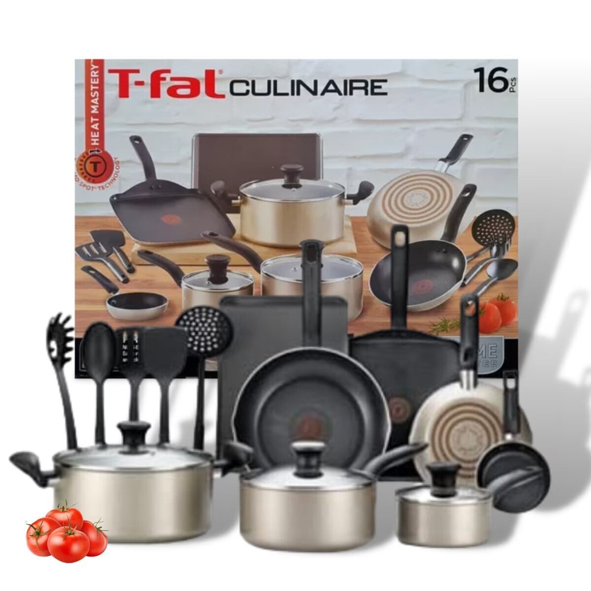 Batería de cocina T-fal Culinaire elaborada en aluminio color champagne; Diseñada pensando en el chef de todos los días. La tecnología única Thermo-Spot muestra cuando la sartén está perfectamente precalentada y lista para comenzar a cocinar. T-fal Culinaire tiene un interior antiadherente que es resistente a los arañazos, lo que facilita la cocción y la limpieza. La base de aluminio garantiza un calentamiento rápido y uniforme para obtener resultados fiables en todo momento. Las sartenes cuentan con boquillas para verter, haciendo que desechar los aceites o el exceso de líquidos sea muy fácil. Los utensilios de cocina son aptos para horno hasta 170° C. Las ollas y sartenes Culinaire son aptas para lavavajillas para mayor comodidad.