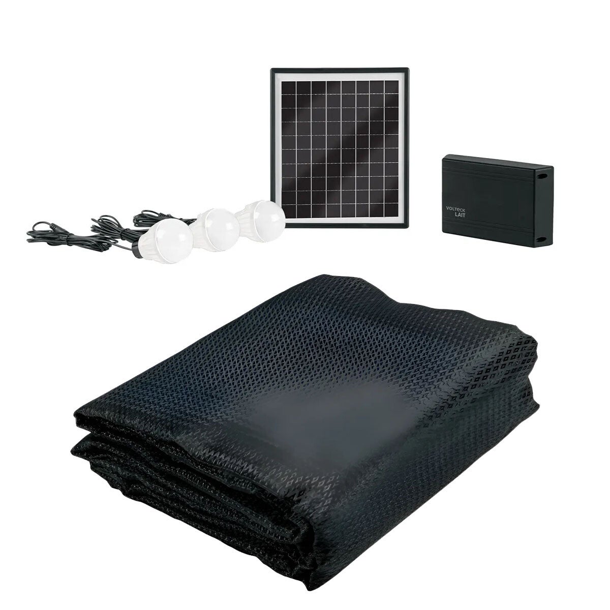 Un kit de iluminación autosustentable. Utiliza un panel solar para cargar una batería interna que alimenta focos LED de alta eficiencia. Es la respuesta perfecta para iluminar interiores de toldos, cabañas o áreas comunes sin gastar un solo peso en electricidad.