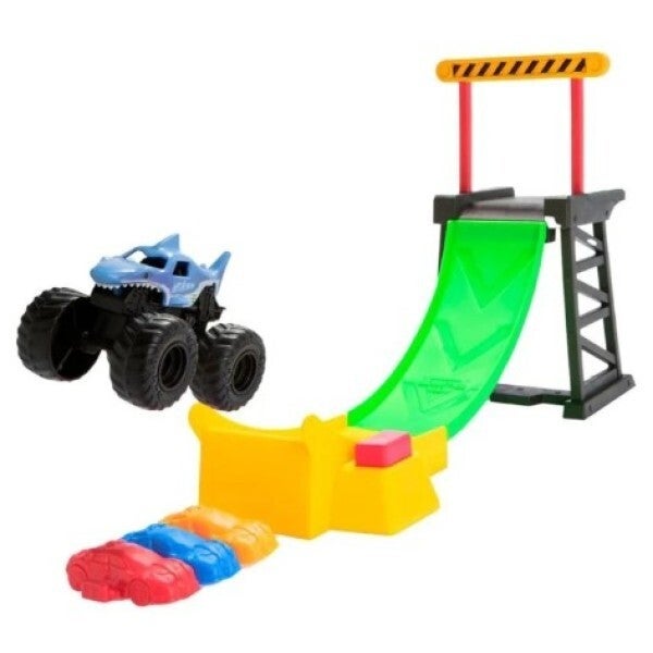 ¡Arma tu propio estadio y vive la competencia extrema! Con este playset Monster Jam 1:72 la acción nunca se detiene.